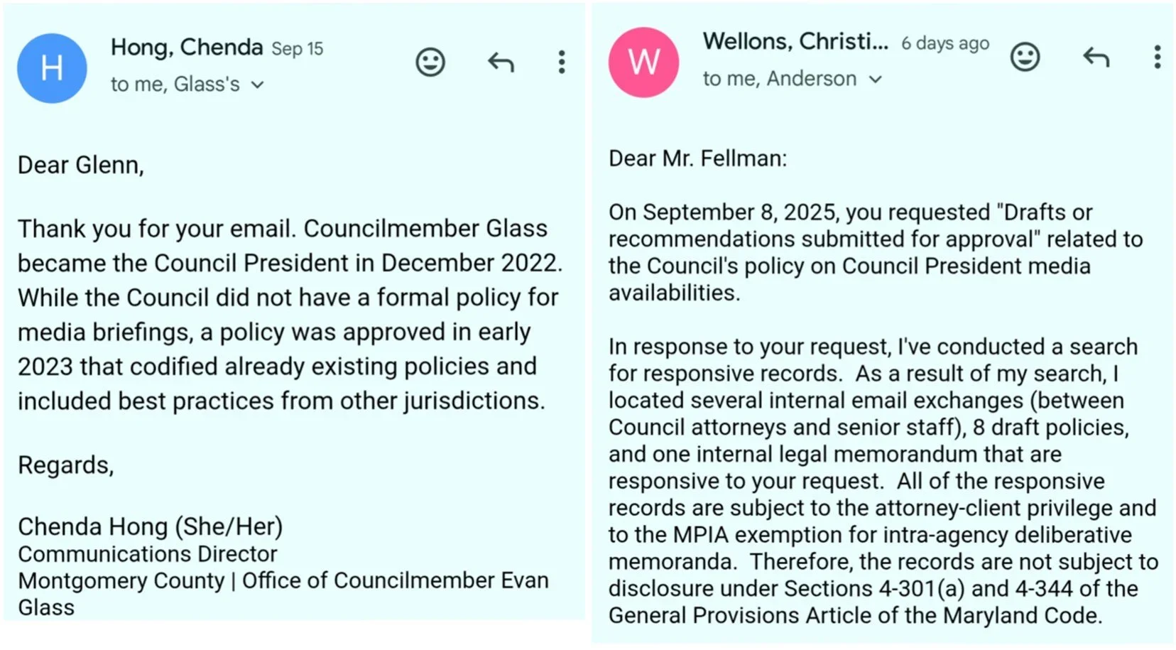 When questions arose about how and why this gatekeeping rule was created, the record went dark. In response to a Maryland Public Information Act (MPIA) request, Chief Legislative Attorney Christine Wellons acknowledged that at least eight draft versions, internal legal memoranda, and related emails about the policy exist. She refused to release any of them, citing attorney–client privilege and the deliberative process exemption. The result is a complete blackout on who initiated the policy, what problem it was meant to solve, or whether it was vetted or approved by any public process.