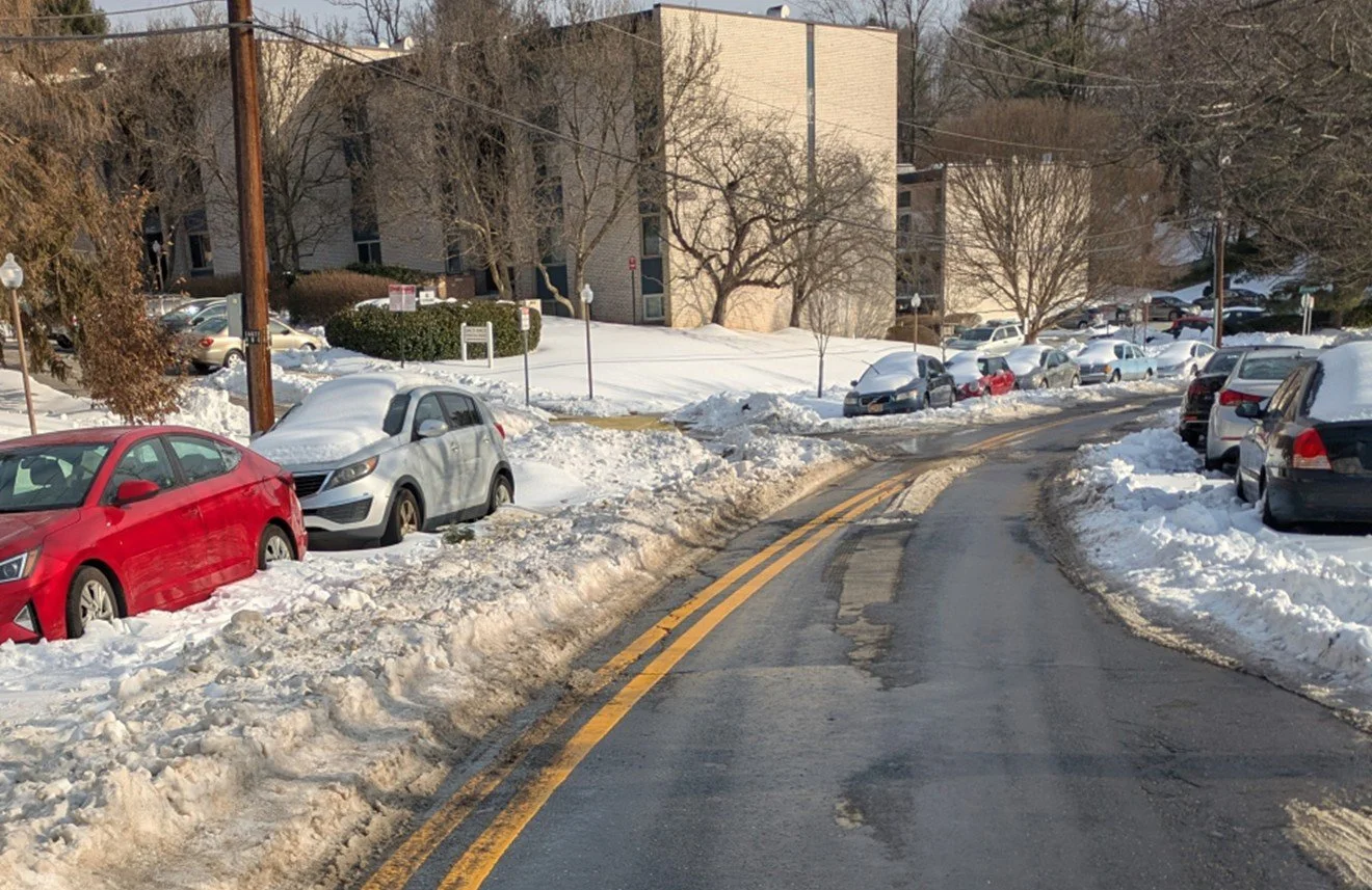 Off campus, however, the situation was mixed for sidewalks and neighborhood driving conditions. In many residential areas surrounding the schools, streets were reduced to a single passable lane, with twisty tracks carved between snowbanks and occasional ice and snow lumps still in the travel path. A school bus could likely make it through these streets, but the narrow lanes would create traffic pinch points, with vehicles forced to pause and negotiate passing in tight stretches.